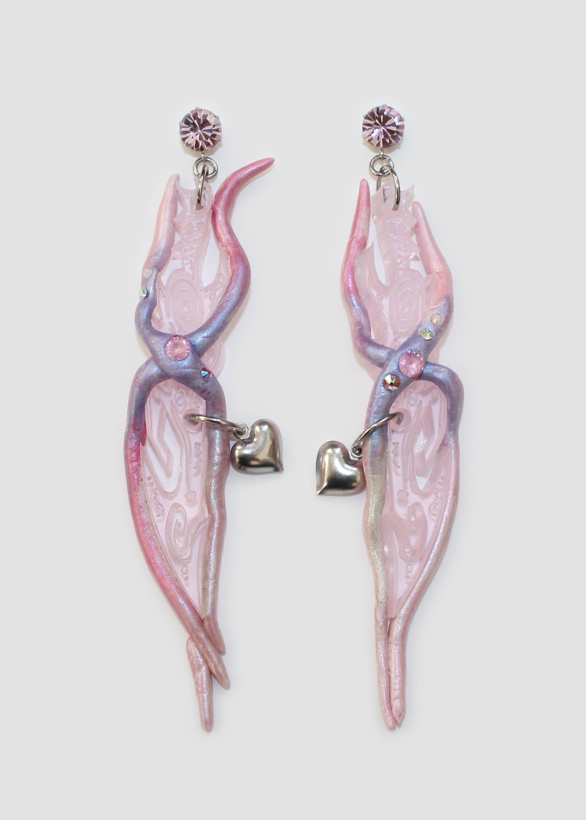 Stainless steel post earrings, acrylic, epoxy, crystal, stainless steel hearts
